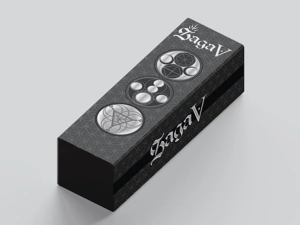 After deciding on the magnet-closure box, there was now an extra interior flap that needed to be addressed in the final design. I lined this space with gold leaf and used it as an opportunity to feature the symbol version of the Saga V logo, since the full logo was already displayed on the front of the box. The symbol was embossed into the gold leaf, adding both texture and visual interest to what would have otherwise been unused space.
